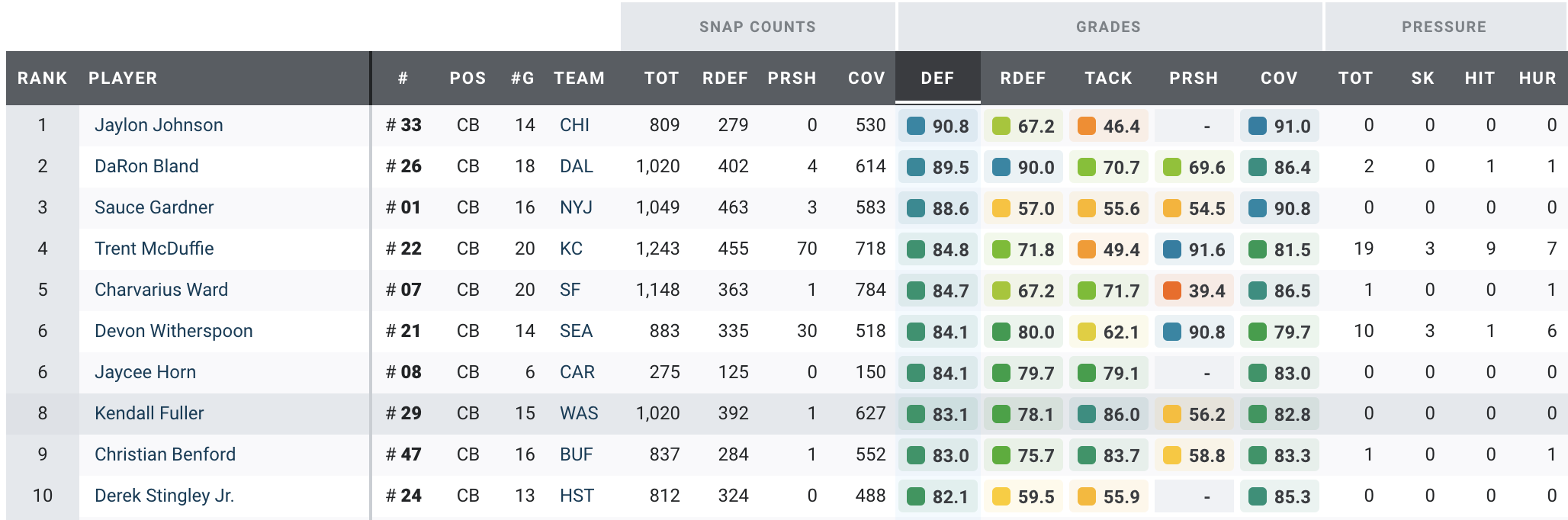 These cornerback rankings consider several factors: PFF coverage grade (which is primarily influenced by plays where the defender was targeted), ability to prevent separation, difficulty of assignment and PFF grade on plays where the players were not targeted.