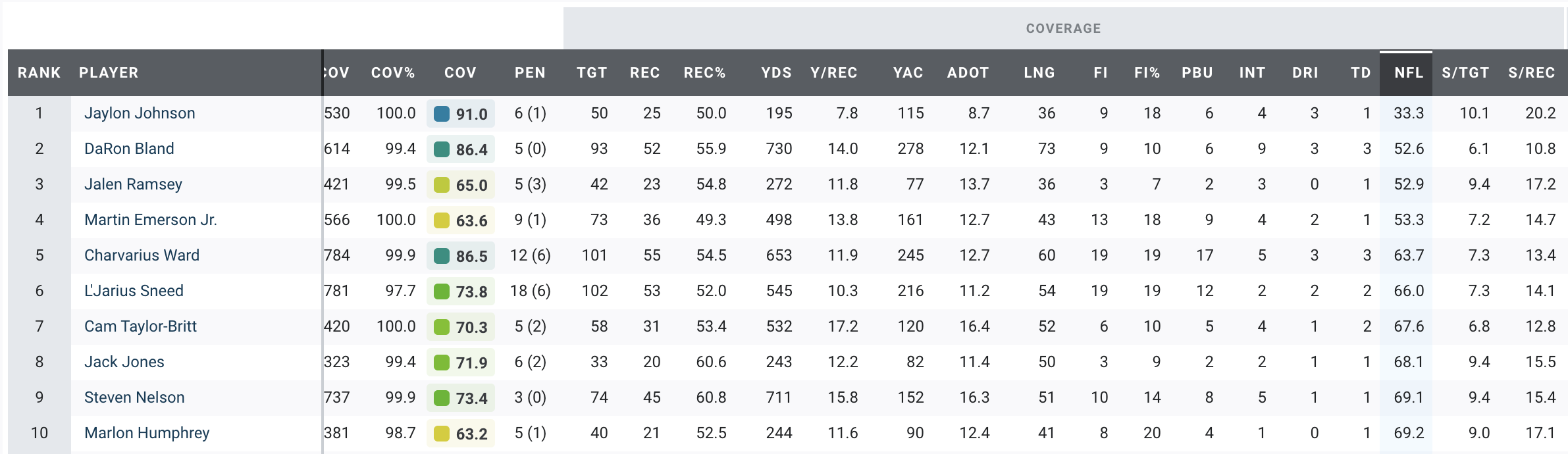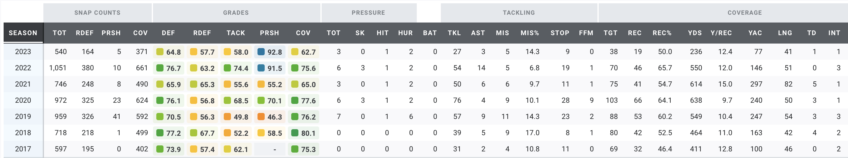 Johnson started to show signs of great play in 2022 when he ranked 26th in the advanced metrics despite posting a middling 65.2 coverage grade. He then put it all together in 2023.