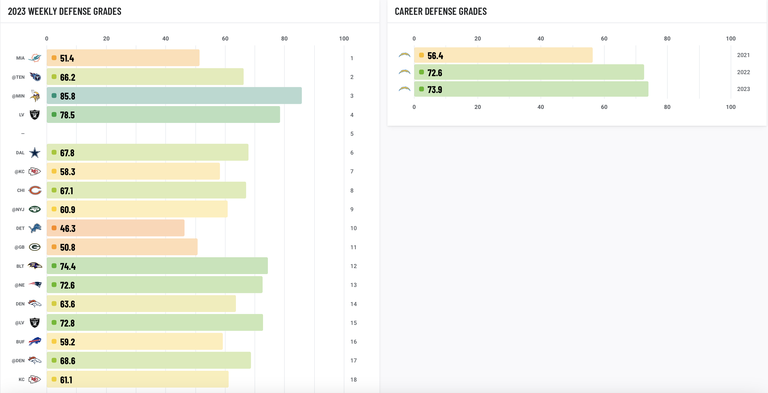 Fuller has been excellent for several years now, putting up an 85.0 grade over the last two seasons and preventing separation at a very high level. While he won’t wow on the stat sheet with gaudy interception or forced incompletion numbers, he’s as reliable as they come when it comes to making tackles and being sticky in coverage.