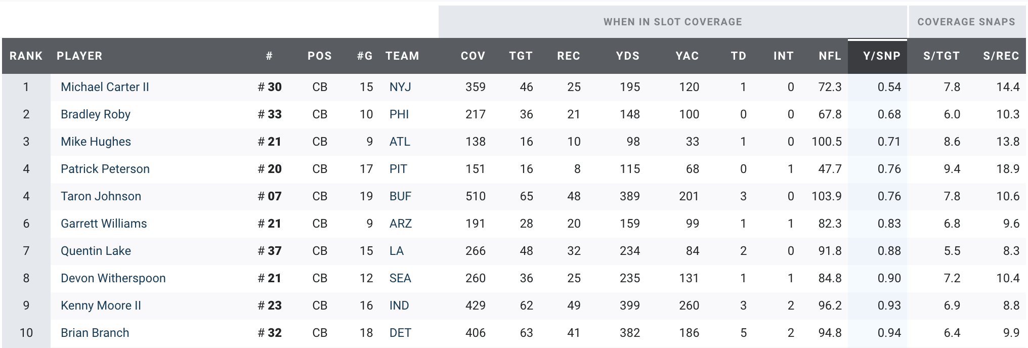 The Jets boast two top-10 cornerbacks, as Carter has been arguably the best slot cornerback in the game over the last two seasons. He allowed just one touchdown and eight first downs in 2023, giving up just 0.62 yards per coverage snap. He prevents separation and grades exceptionally well.
