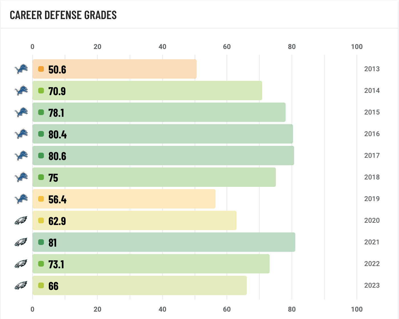 We might have seen the cliff for Slay, as his 65.4 coverage grade marked a three-year low while his advanced metrics looked even worse. His career-long play kept him on the list, though, and he’ll have a lot to prove in 2024 as the Eagles look to get back on track.