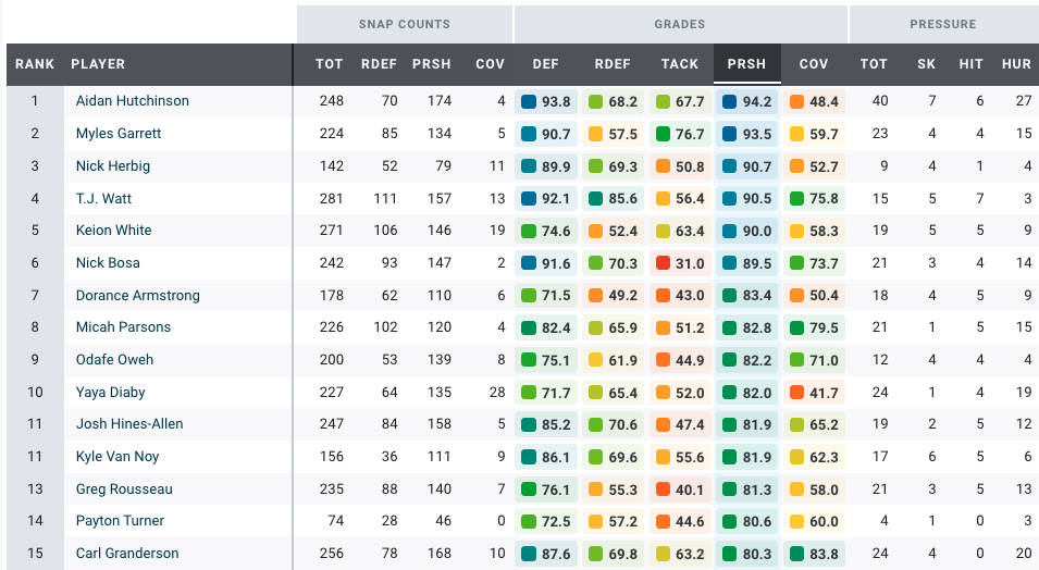 Meanwhile, Green Bay's Xavier McKinney has emerged as the highest-graded safety this season (90.8). After playing at an elite level in coverage last year for the Giants, McKinney’s 90.7 coverage grade leads all safeties through five weeks, and his play is largely responsible for the Packers surrendering the seventh-lowest passer rating allowed this season (81.5).