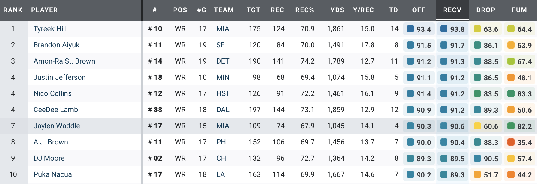 • Amon-Ra St. Brown enters the top 10: The fourth-round pick has been a top-five receiver in PFF grading over the last two years.