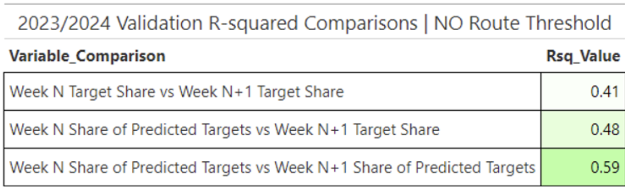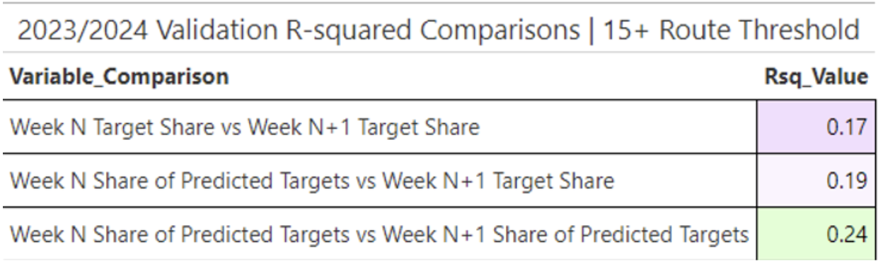 One straightforward way to validate our model is to use our Share of Predicted Targets to forecast the Next-Week Target Share and then compare those predictions against standard Target Share metrics.