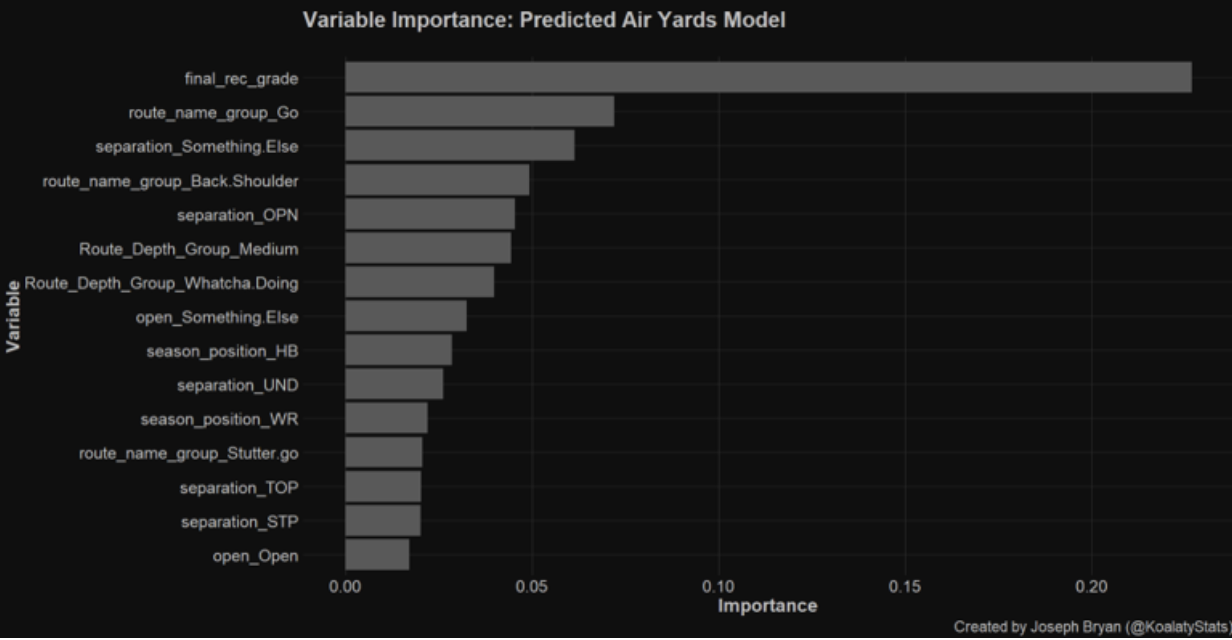 While discussing with Timo, he suggested building a similar model that focuses on targeted routes to develop a “Predicted Air Yards” metric. This metric would help answer the question: “If the receiver had been targeted, how many air yards would they have gained?”
