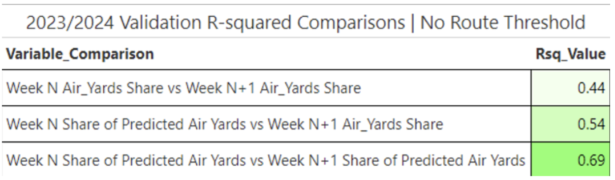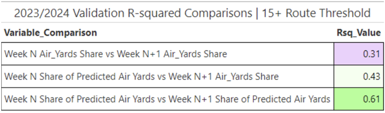 •Using Share of Predicted Air Yards ([Predicted Air Yards]/[Sum of Team Predicted Air Yards]), we gain significantly more predictive power for projecting Next Week Air Yards! Plus, we achieve greater overall stability, just as we did when utilizing Share of Predicted Targets.