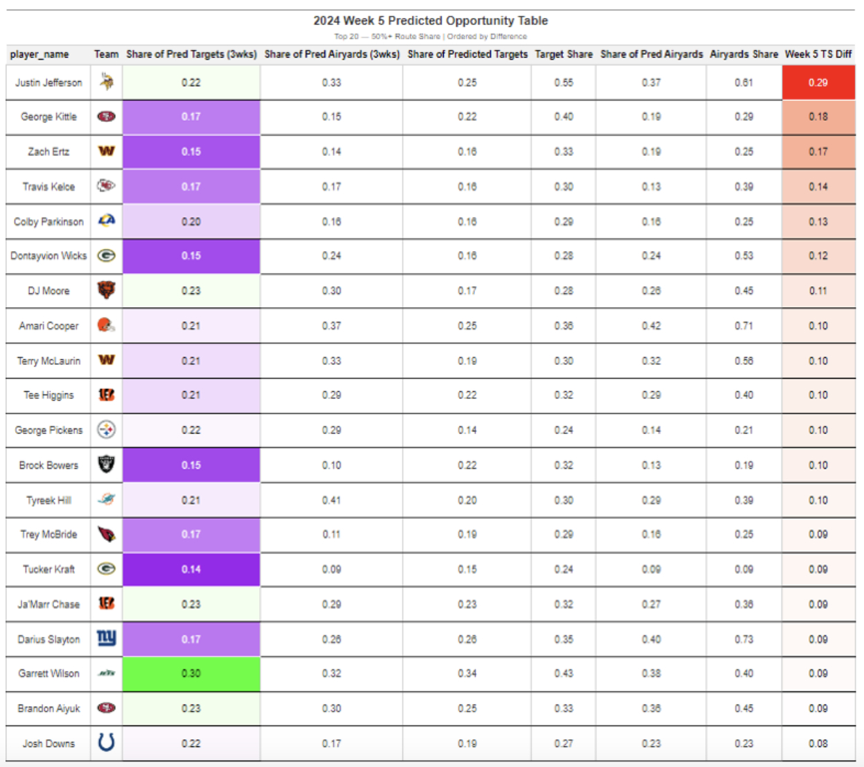 Jefferson had a significant 30% difference between his Share of Predicted Targets and Target Share, highlighting how elite players tend to draw targets even when other options are open.