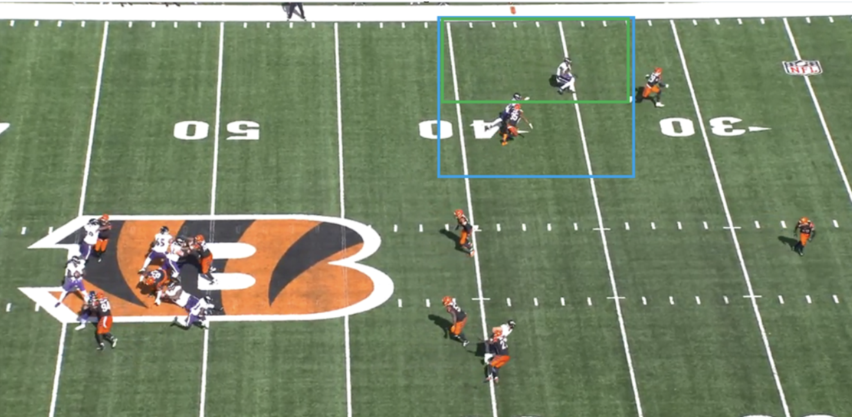 Lamar Jackson ended up throwing this to Justice Hill, and there was offensive holding on the play. I'm not sure if Jackson knew about the penalty, but Bateman was wide open on a hitch/comeback route at the top of the play. There was a 40%-plus chance of Bateman being targeted.
