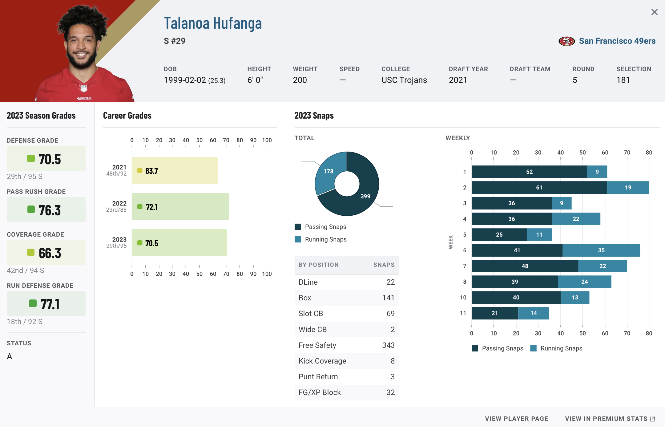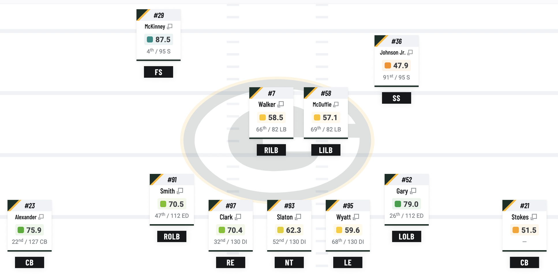 | TE George Kittle (87.7) | LB De’Vondre Campbell (65.1) |