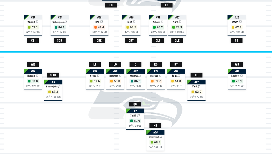 | LG Damien Lewis (59.6) | CB Mike Jackson (77.0) |