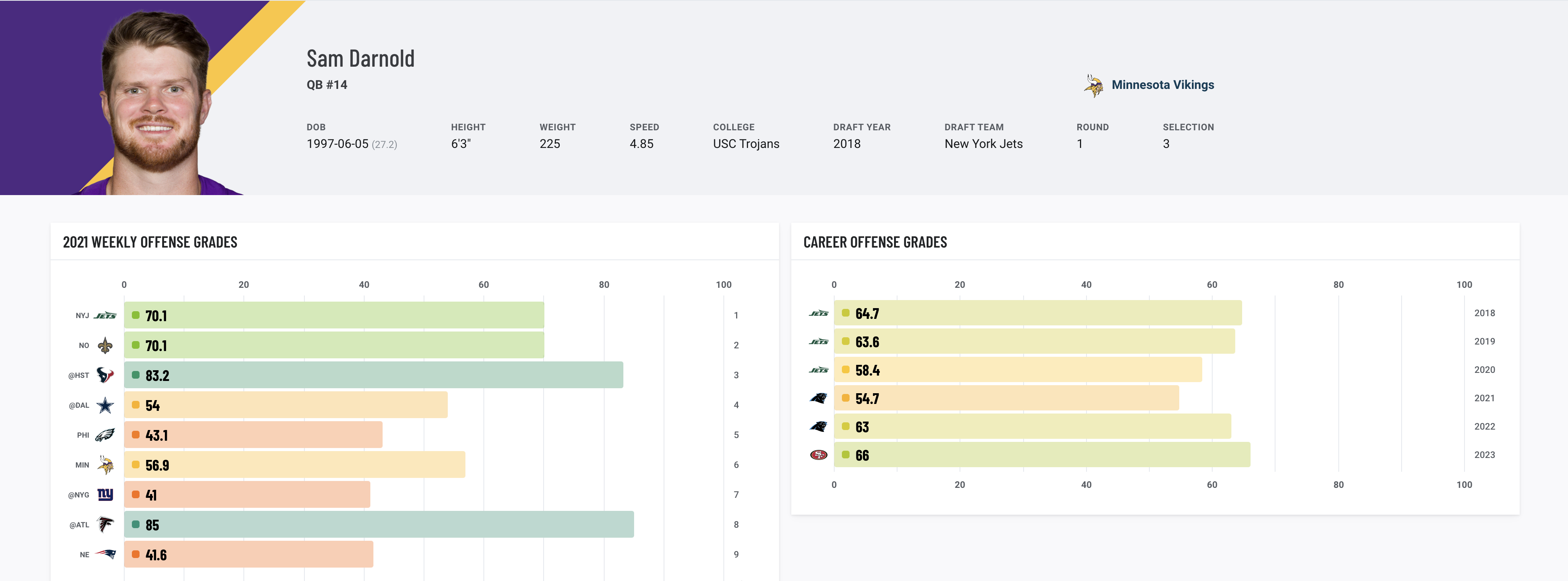 | TE Tyler Conklin (65.6) | LB Quincy Williams (81.1) |