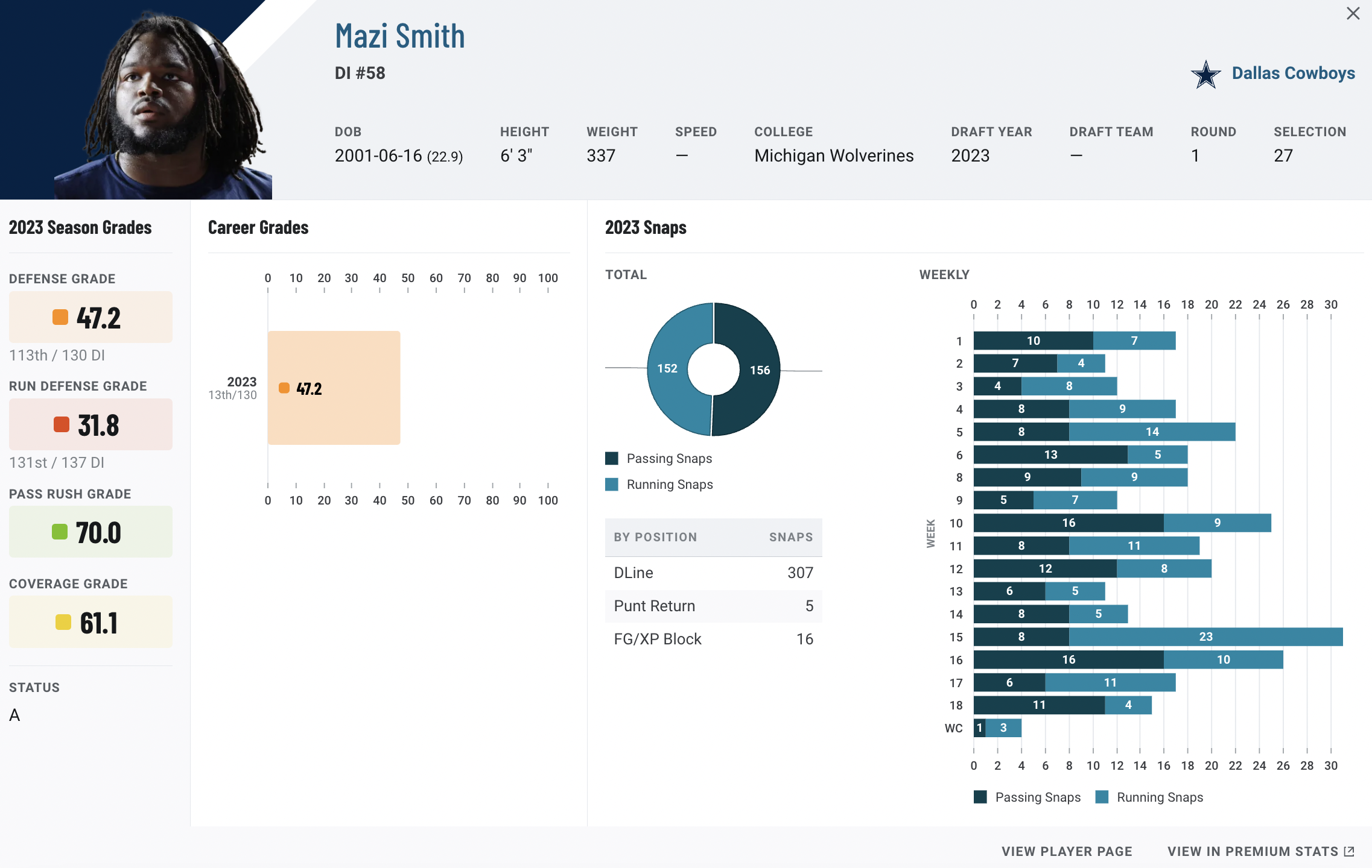 | LT Tyron Smith (83.7) | CB Sauce Gardner (88.6) |