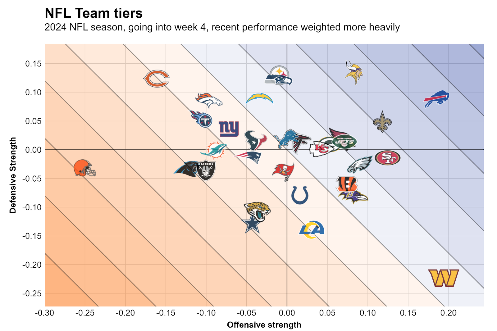 The following chart shows how good teams have been by expected points added per play. To improve predictive power, high-leverage plays such as turnovers and goal-line plays are down-weighted a bit. Additionally, the team strengths account for opponents faced and recent performances count more toward the estimated team strength than performances earlier in the season.