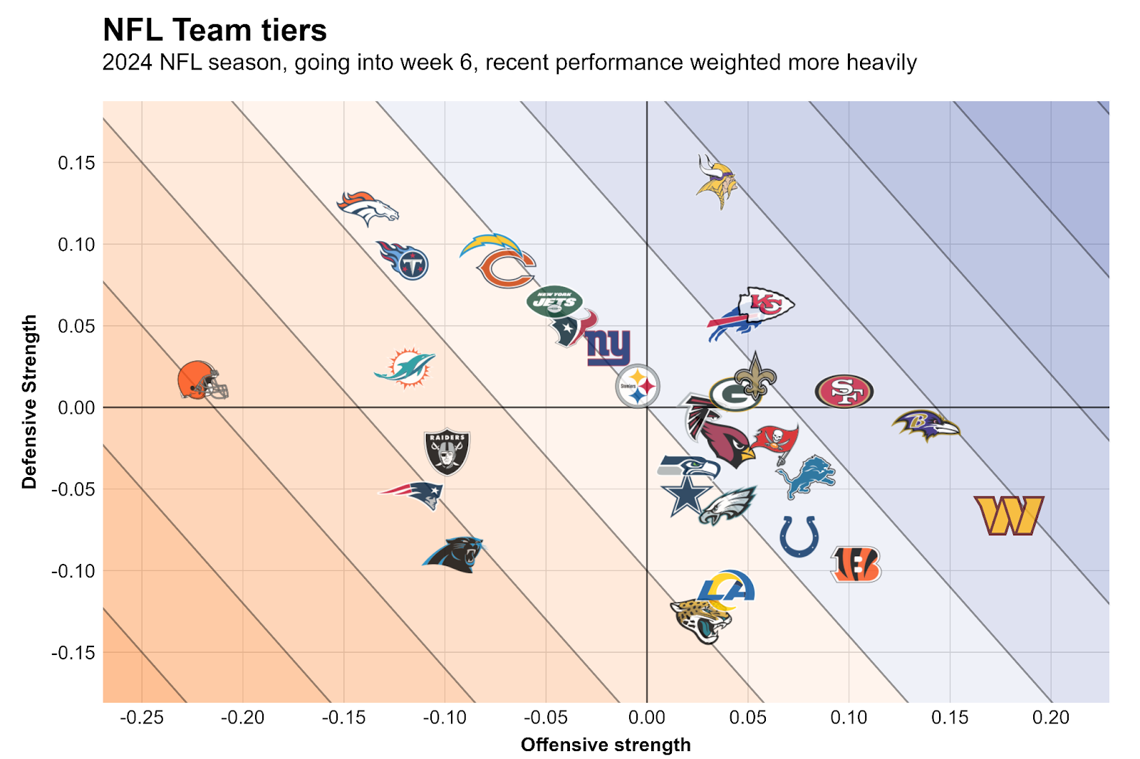 The following chart shows how good teams have been by expected points added per play. To improve predictive power, high-leverage plays such as turnovers and goal-line plays are down-weighted a bit. Additionally, the team strengths account for opponents faced and recent performances count more toward the estimated team strength than performances earlier in the season.
