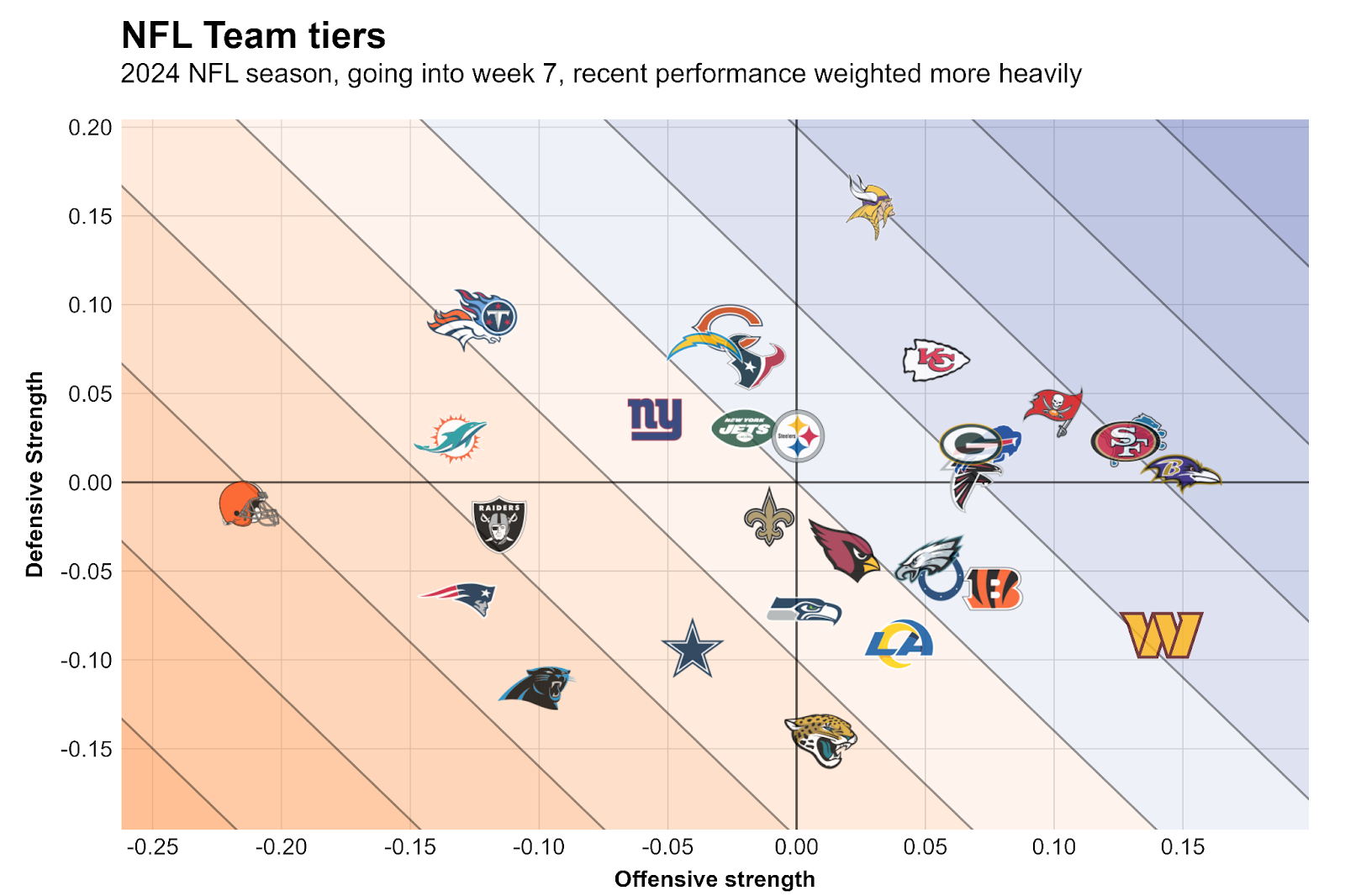 The following chart shows how good teams have been by expected points added per play. To improve predictive power, high-leverage plays such as turnovers and goal-line plays are down-weighted a bit. Additionally, the team strengths account for opponents faced and recent performances count more toward the estimated team strength than performances earlier in the season.