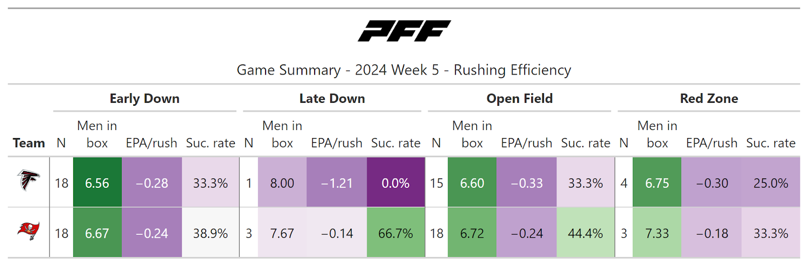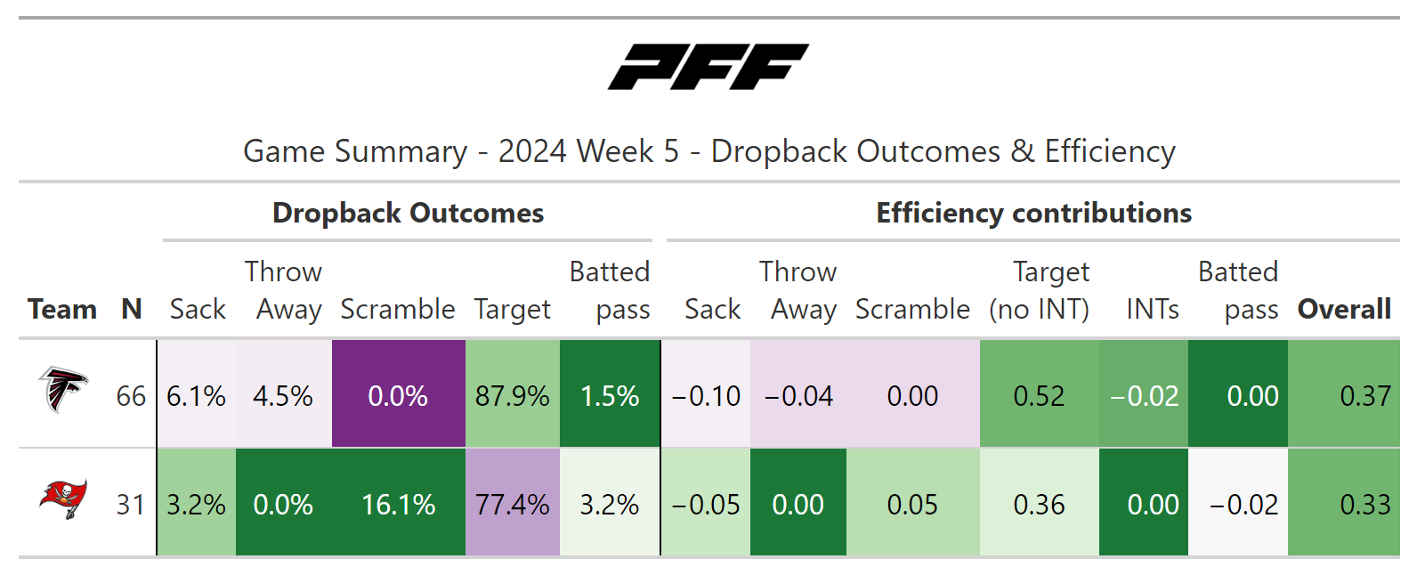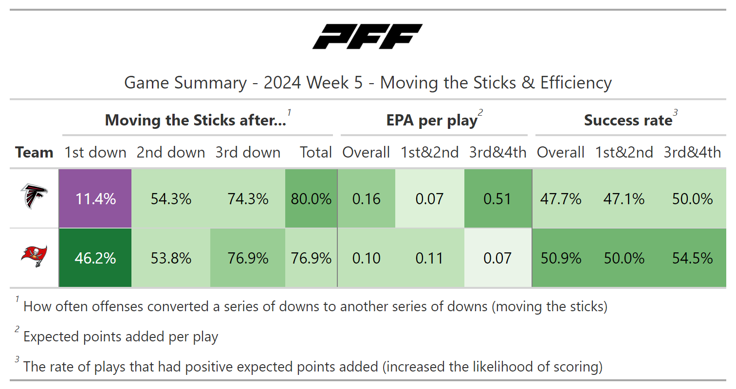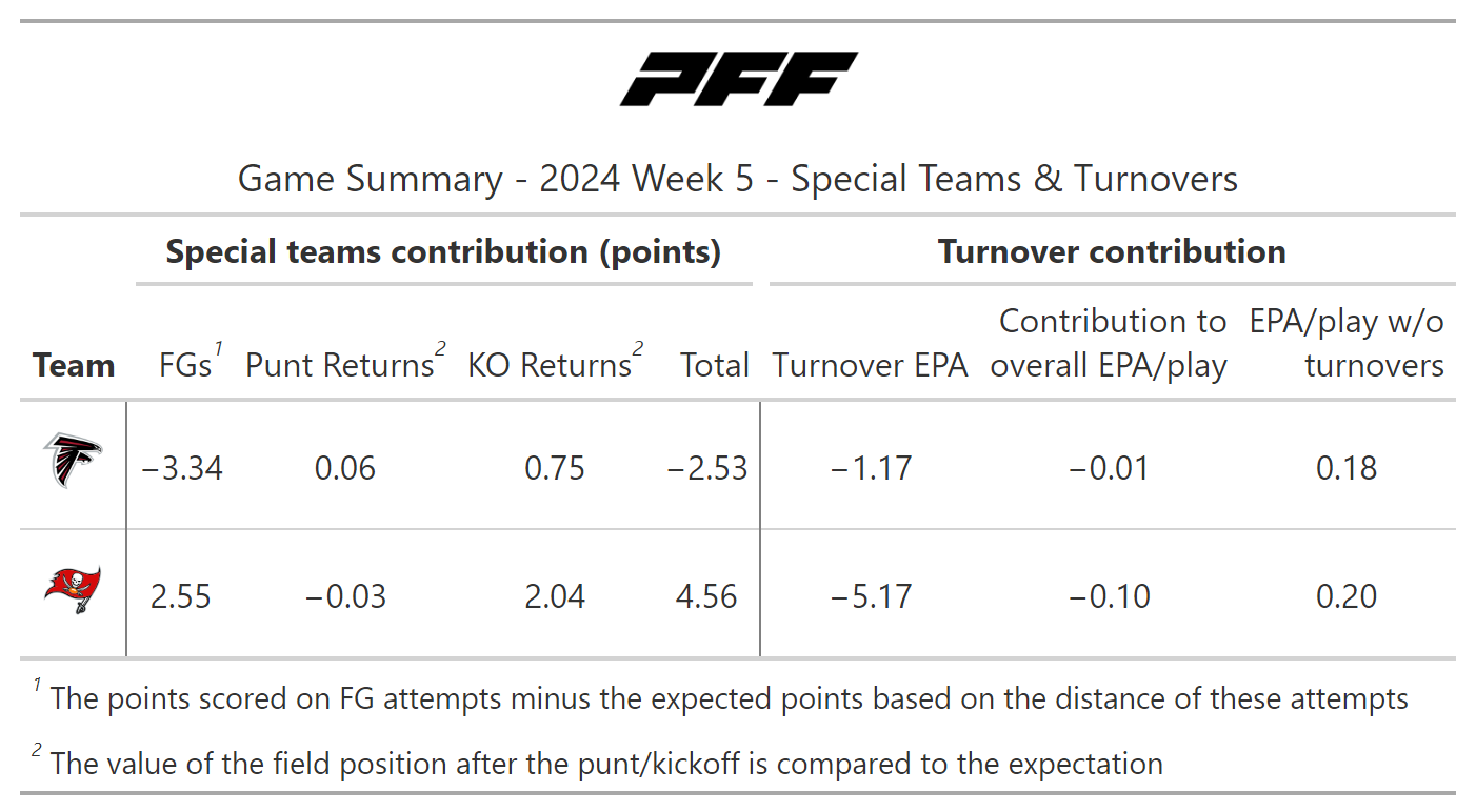 According to PFF's noise-canceled score metric, the game was close going into overtime, but the Falcons were certainly not an undeserved winner. They moved the ball slightly better and might have won in regulation if not for missing two field goals in a row.