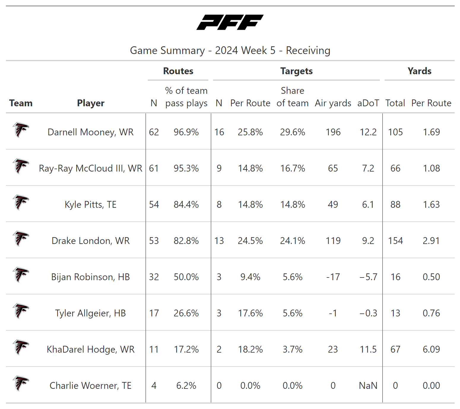 • Kyle Pitts finally joins the passing party: After not catching a pass in Week 4, Pitts was part of a lethal Falcons passing attack in this game.