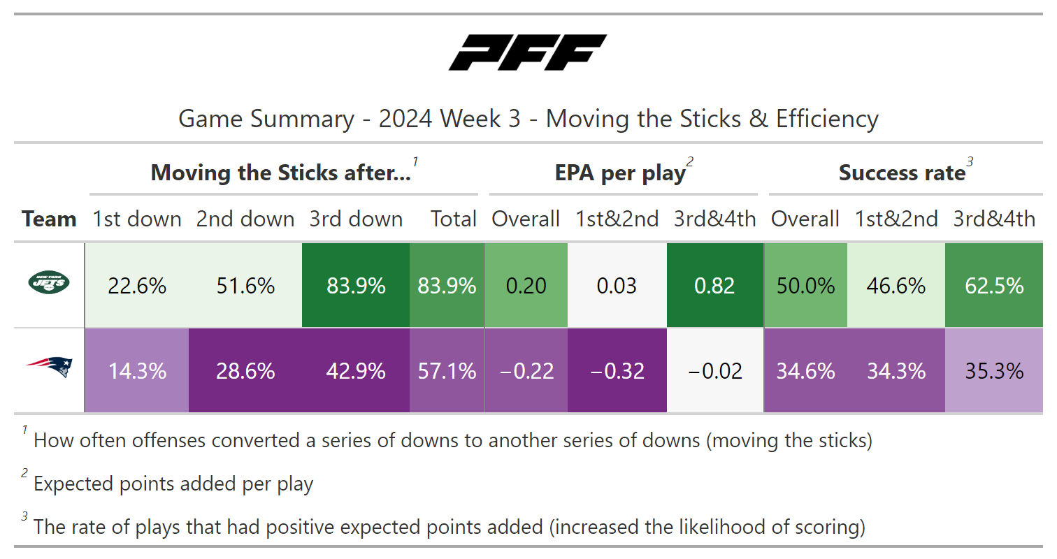 The New York Jets dominated the New England Patriots on Thursday Night Football, winning 24-3. Here is our initial statistical breakdown of the game.