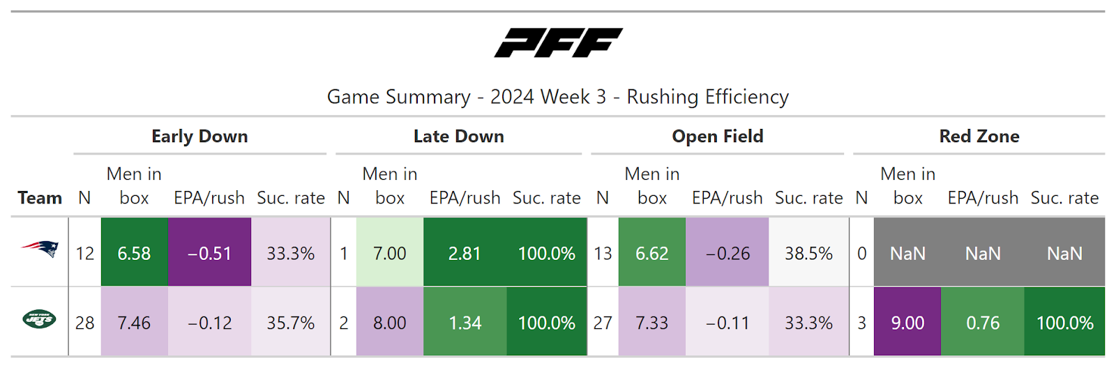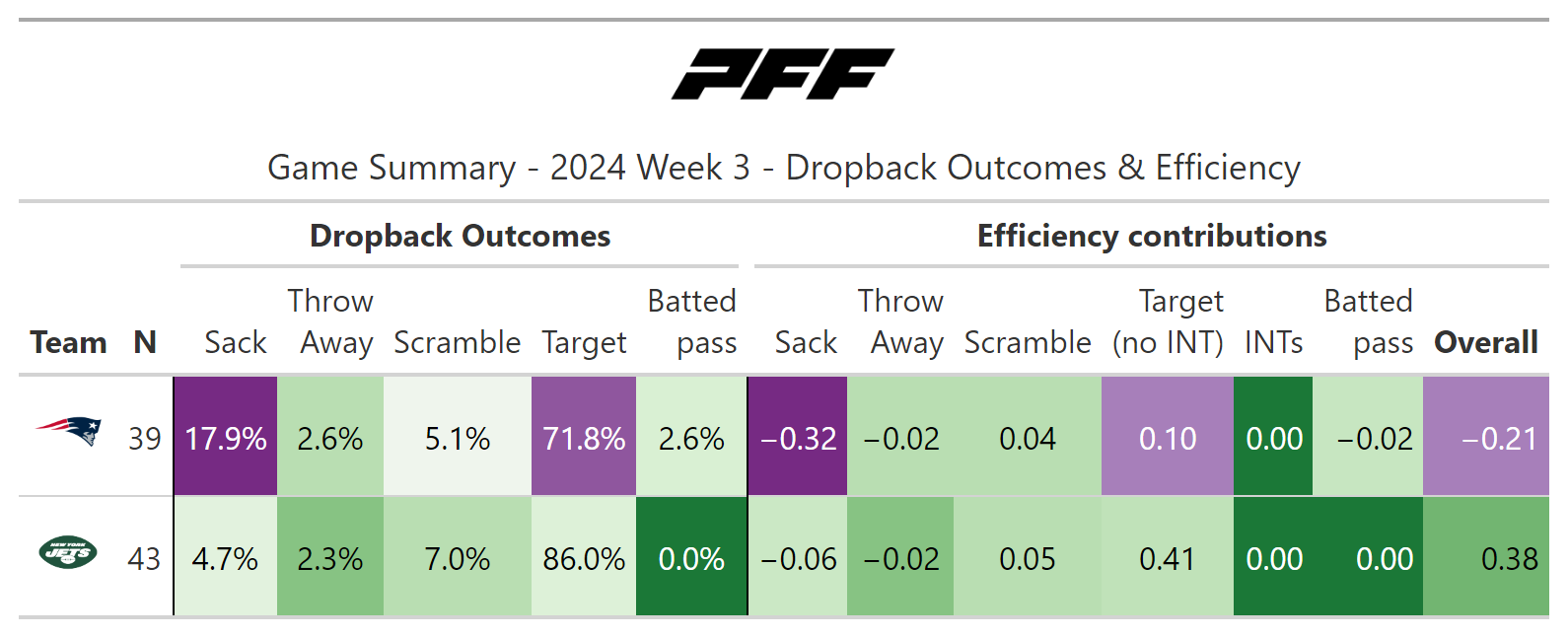 According to PFF's new noise-canceled score metric, the game was just as lopsided as it felt. The Jets moved the ball at will and the Patriots couldn’t get anything done offensively. The only reason they could have scored double-digit points was their marching down the field in garbage time before getting sacked near the goal line to close out the game.