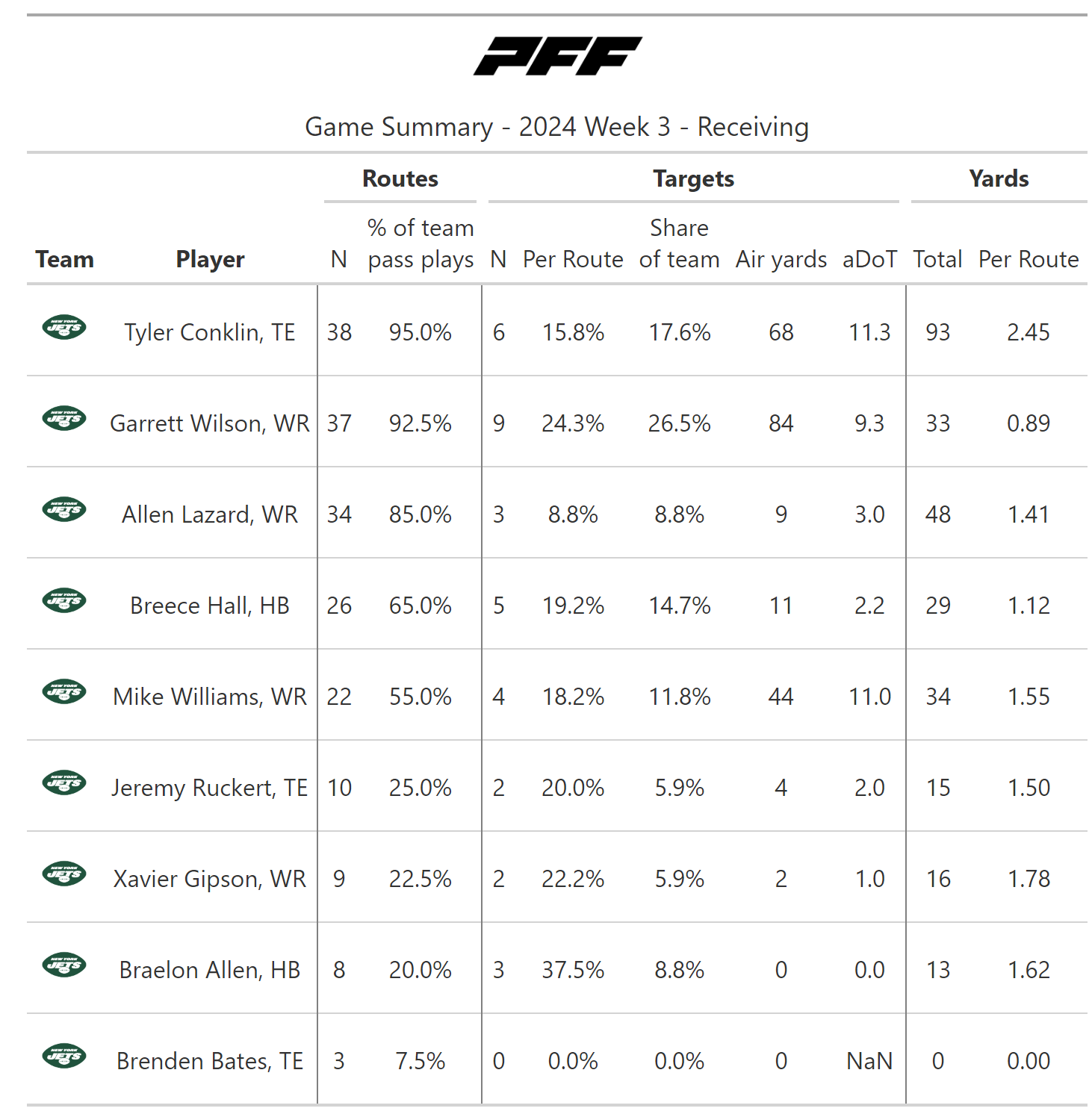 Garrett Wilson led the Jets in targets, cementing his No. 1 receiver status. Nevertheless, tight end Tyler Conklin outproduced him on the night.