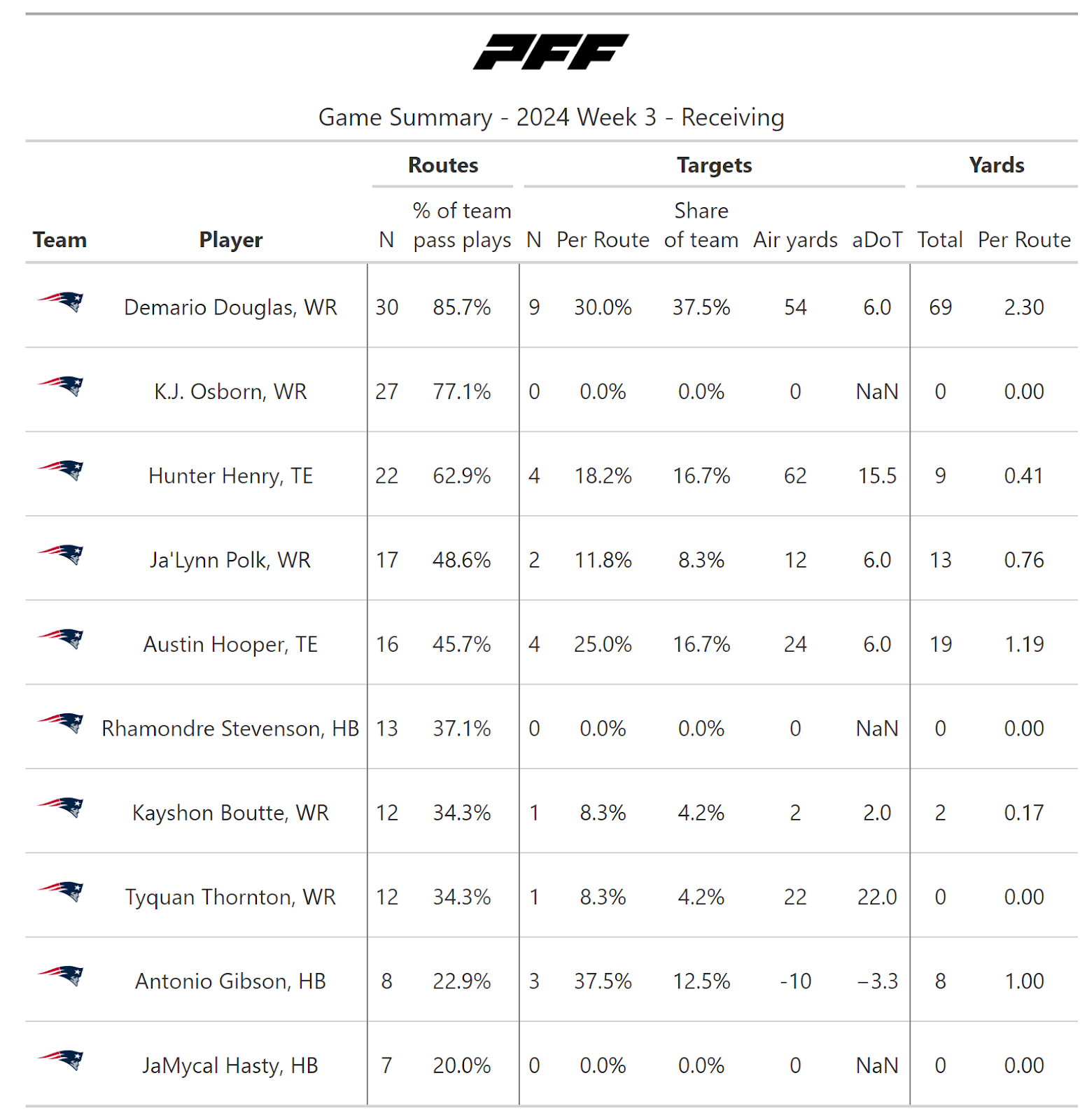 Hunter Henry led the Patriots in target share going into last night, but this time, Demario Douglas was the only receiver who contributed meaningfully to a poor Patriots passing attack.