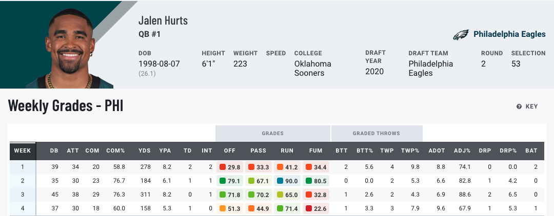The Bills were handed their first defeat of the season without much pushback, losing to the Ravens 35-10 on Sunday Night Football. As long as Josh Allen is on the field, the Bills will be okay — Allen has earned an 81.1 overall grade, while the offense is third in EPA per play (0.119).