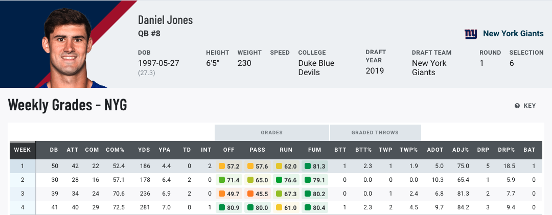 The Lions won a fun Monday Night Football matchup on the back of a historic Jared Goff performance. The quarterback completed 18 of his 18 pass attempts as the Lions progressed to 3-1 on the young season. The offense is sixth in EPA per play (0.095).