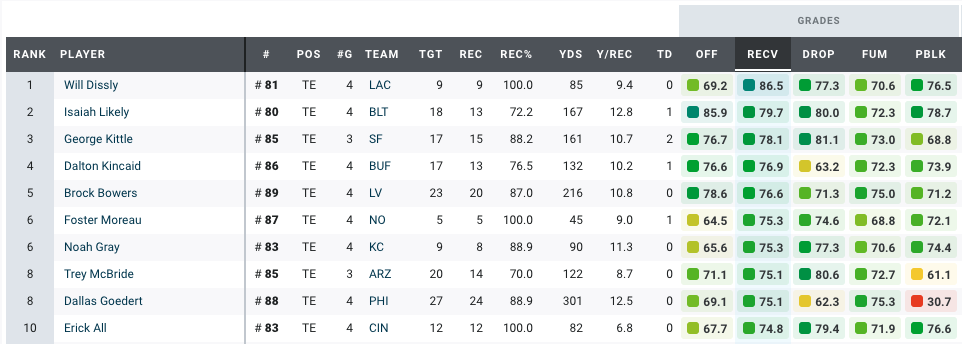 The Chiefs remain a perfect 4-0 on the season, even if it doesn’t feel perfect. The 17-10 win against the Los Angeles Chargers was a slog, and the Chiefs could be without Rashee Rice for some time. On a positive note, Creed Humphrey has earned a 93.1 overall PFF grade, second among all centers.