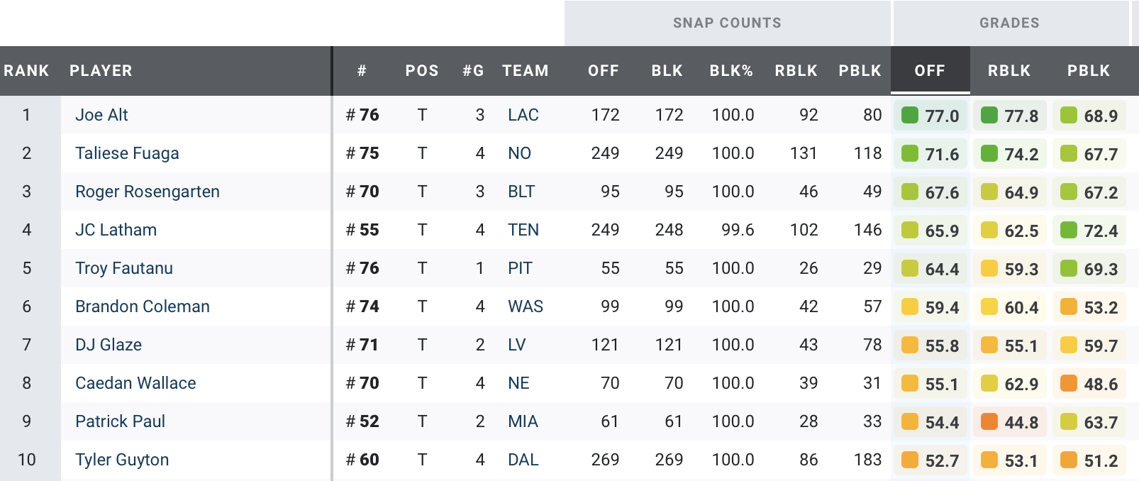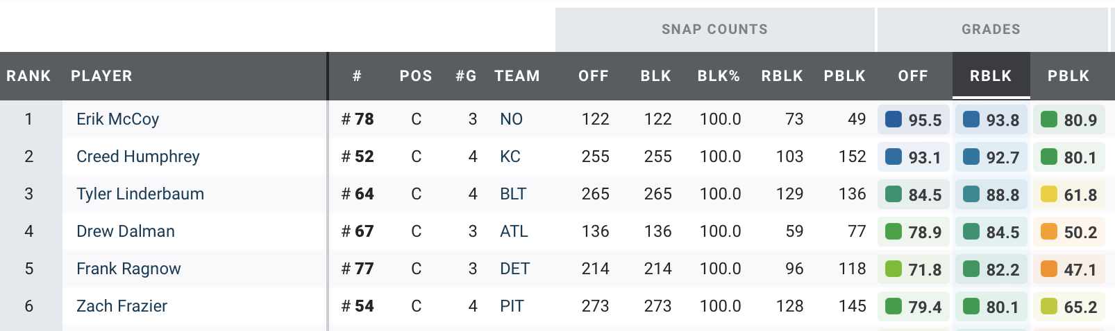 Joe Flacco stepped in for Anthony Richardson and delivered the Colts a 27-24 win against a tough Steelers team. Hopefully, the Colts won’t be without Richardson for long, but Flacco will be ready to go otherwise. The Colts' 80.0 run-blocking grade leads the league.