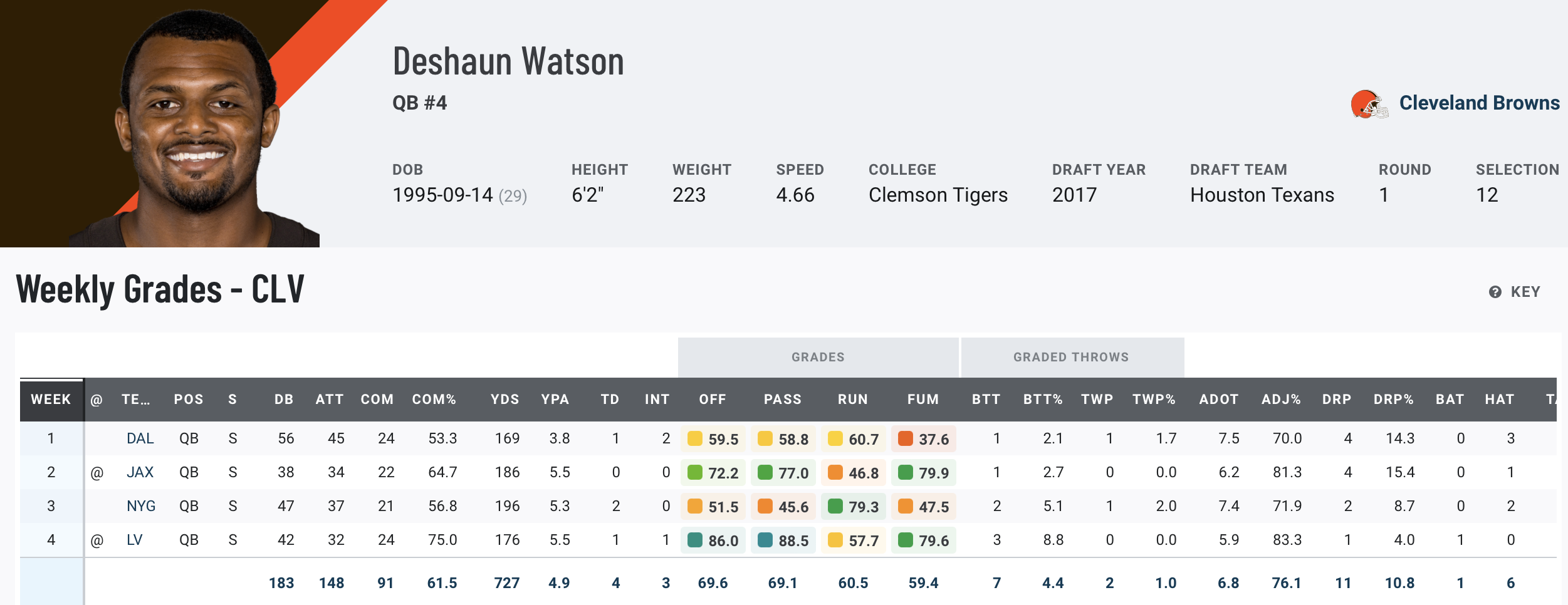 Despite continued issues in pass protection, Watson managed to produce his best grading performance of 2024 in Week 4, generating the second-highest passing grade (88.5) of the week. It may not look impressive when looking at the boxscore, but Watson’s limiting of turnover worthy plays (just two) helps redeem the far less flashy stats.