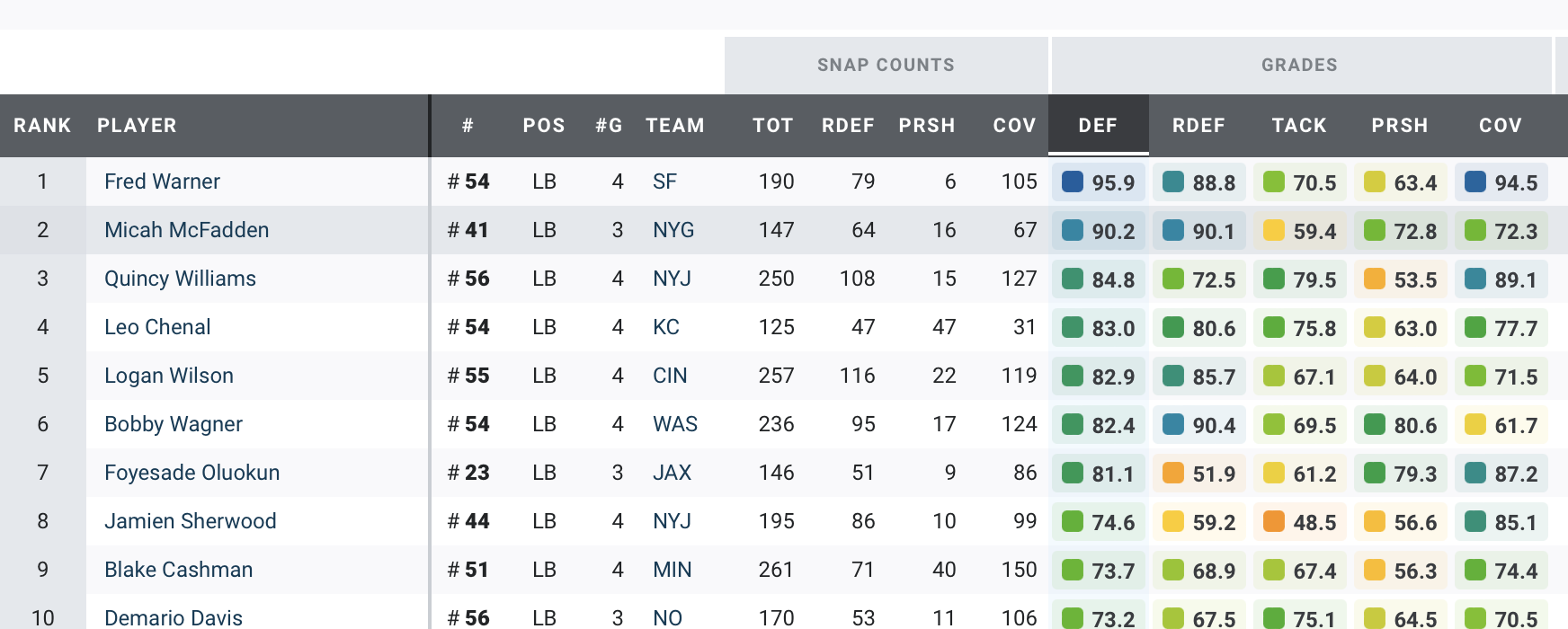 Reed has put together a fantastic start to the year, having earned the second-highest PFF coverage grade (88.6) among qualifying corners — a credit to his 44.9 passer rating allowed and 36% forced incompletion rate on passes into his coverage.