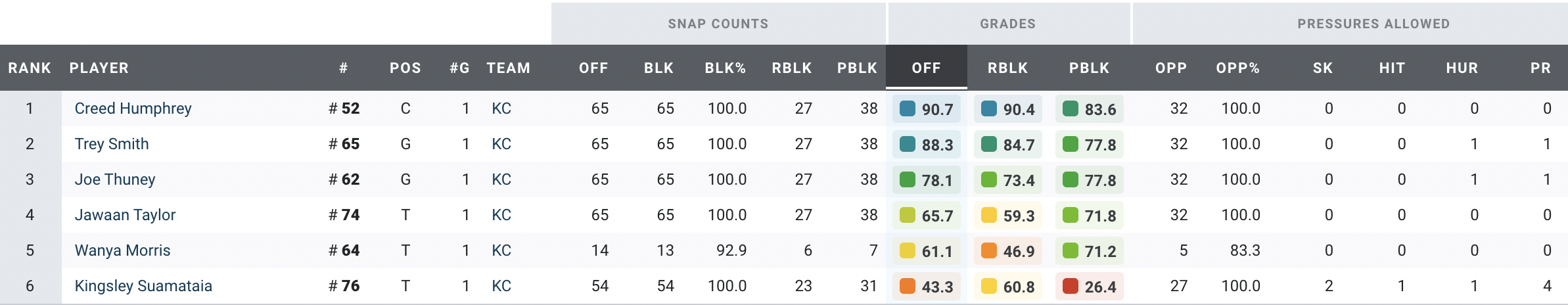 Why the Chiefs won: This wasn’t Patrick Mahomes‘ best game, as he earned just a 58.7 PFF overall grade, but the Chiefs' offensive line kept him virtually clean all game. The unit allowed just six total pressures, and Mahomes was kept clean on 75% of his dropbacks. Kansas City dominated on the ground, too, racking up 149 rushing yards.