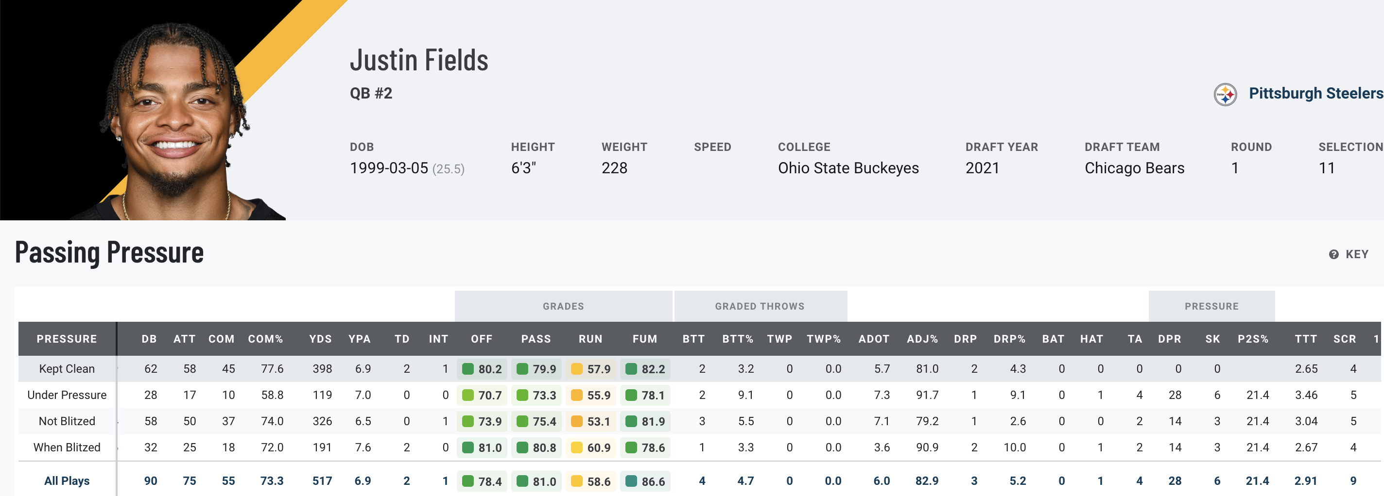 Why the Steelers won: The Steelers’ defense got after the Chargers in Week 3, but Justin Fields’ ability to handle the blitz shone through. Fields completed 8-of-9 attempts when blitzed for 119 yards and a touchdown, earning an 89.1 overall grade.