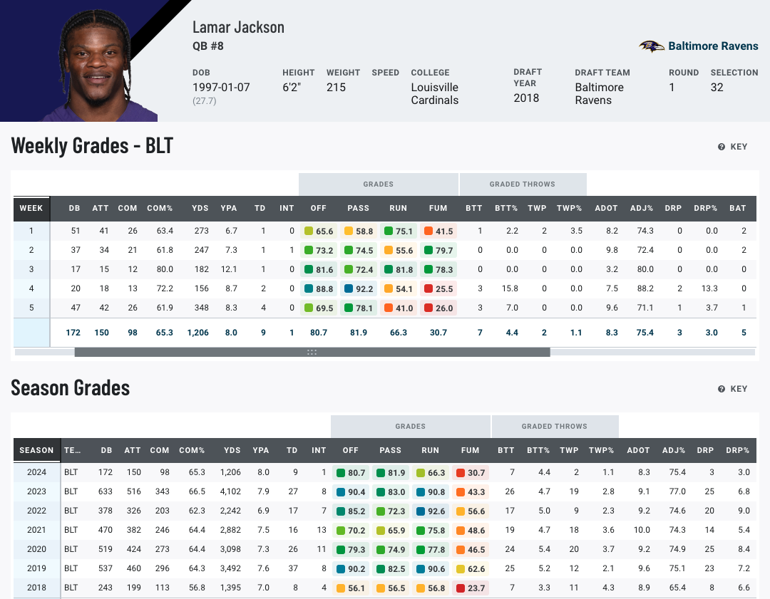 Why the Ravens won: The Lamar Jackson MVP campaign is alive again. Jackson finished 26-of-42 for 348 yards and four touchdowns, and he added another 55 yards on the ground. Jackson was sacked just once, showcasing his ability to escape pressure from all angles. He earned a 78.1 passing grade and registered three big-time throws.