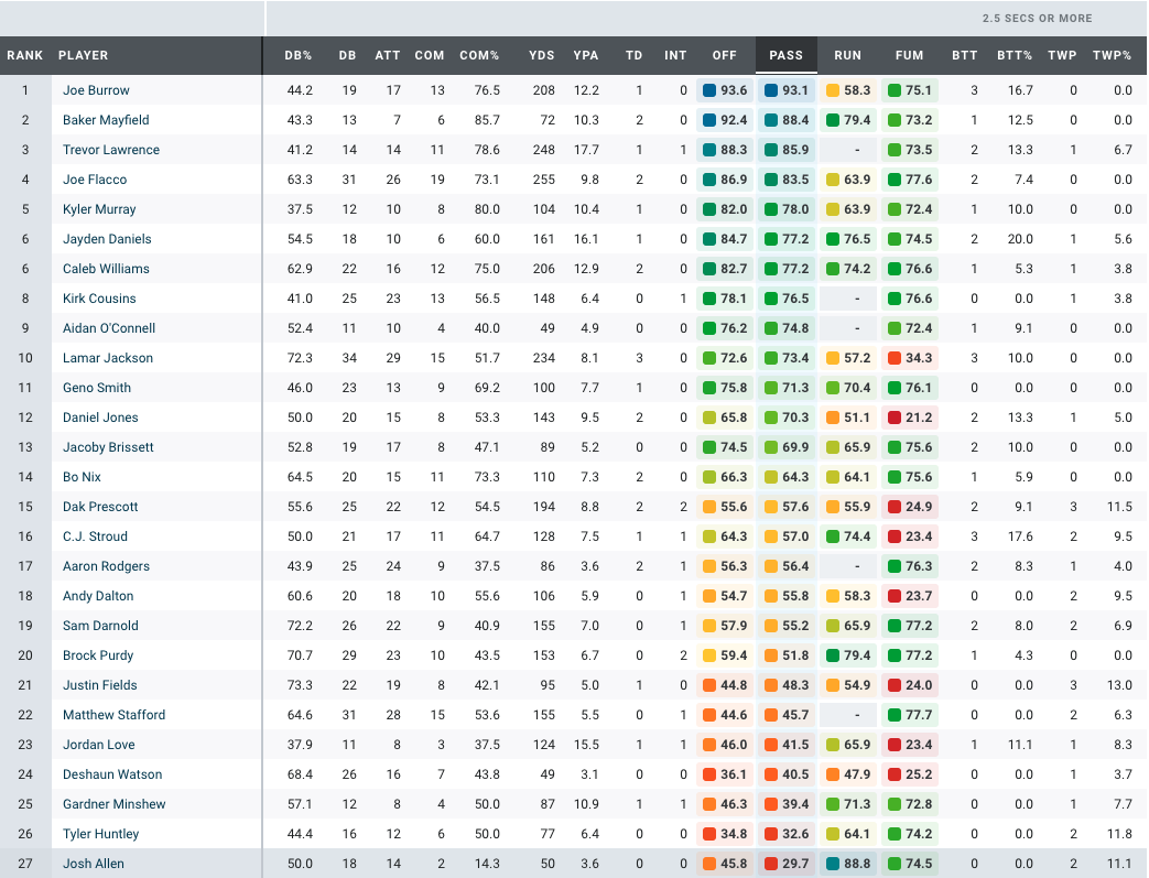 Why the Bengals lost: The Bengals' inability to turn pressures into sacks cost them. The defense generated 28 total pressures and pressured Jackson on 42.6% of his dropbacks, but the unit only sacked the quarterback once. Jackson had a pressure-to-sack rate of just 5%, and his ability to extend and keep plays alive hurt the defense in a big way.