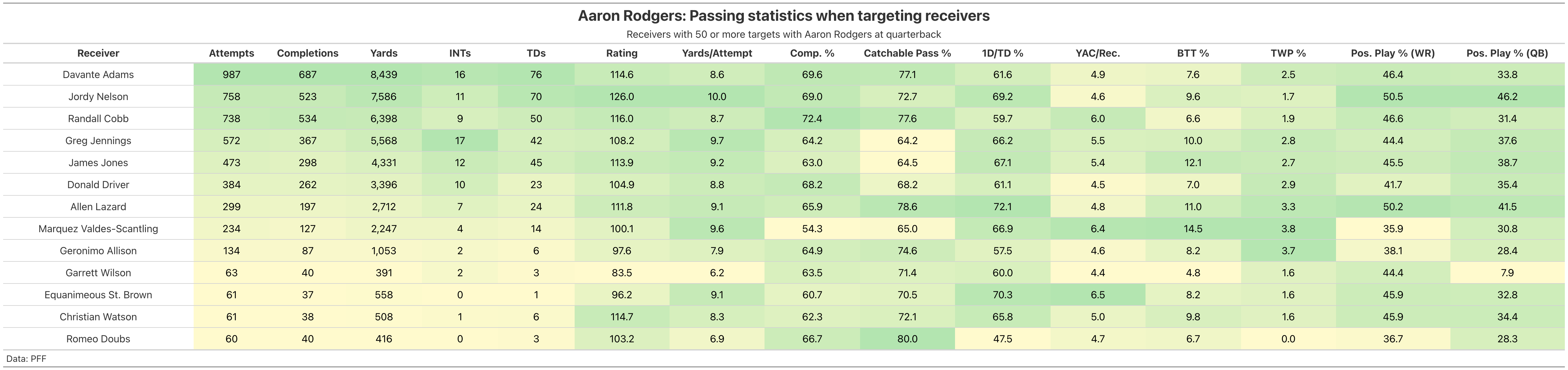 In the PFF era, the Rodgers-Adams pairing ranks fifth among quarterback-receiver duos in targets, plus seventh in yards and second in touchdown passes. Their cumulative greatness led to individual acumen: from 2014-21, Adams' 2.84 PFF WAR ranked fifth among receivers, while Rodgers’ 27.97 WAR was second. Over his career, Rodgers has earned a 95.8 passing grade when throwing Adams' way.